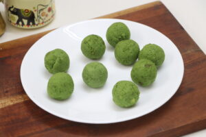 - Take one dough ball and flatten it slightly. Place one stuffing ball in the center and close it tightly from all sides.