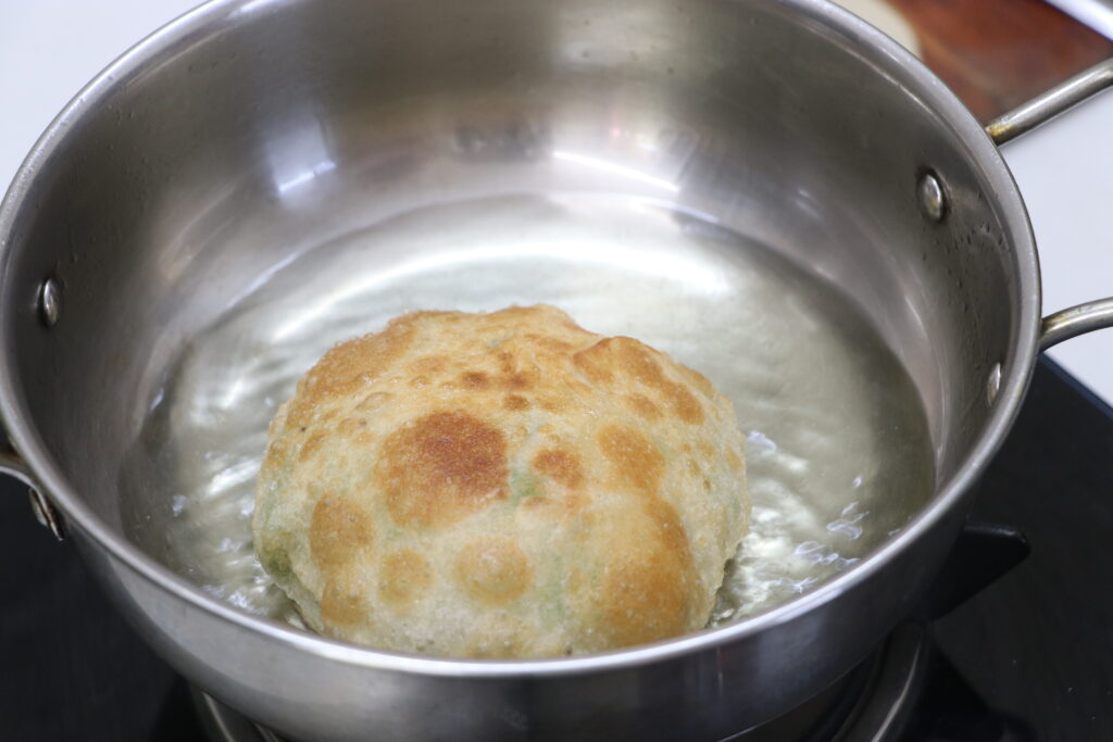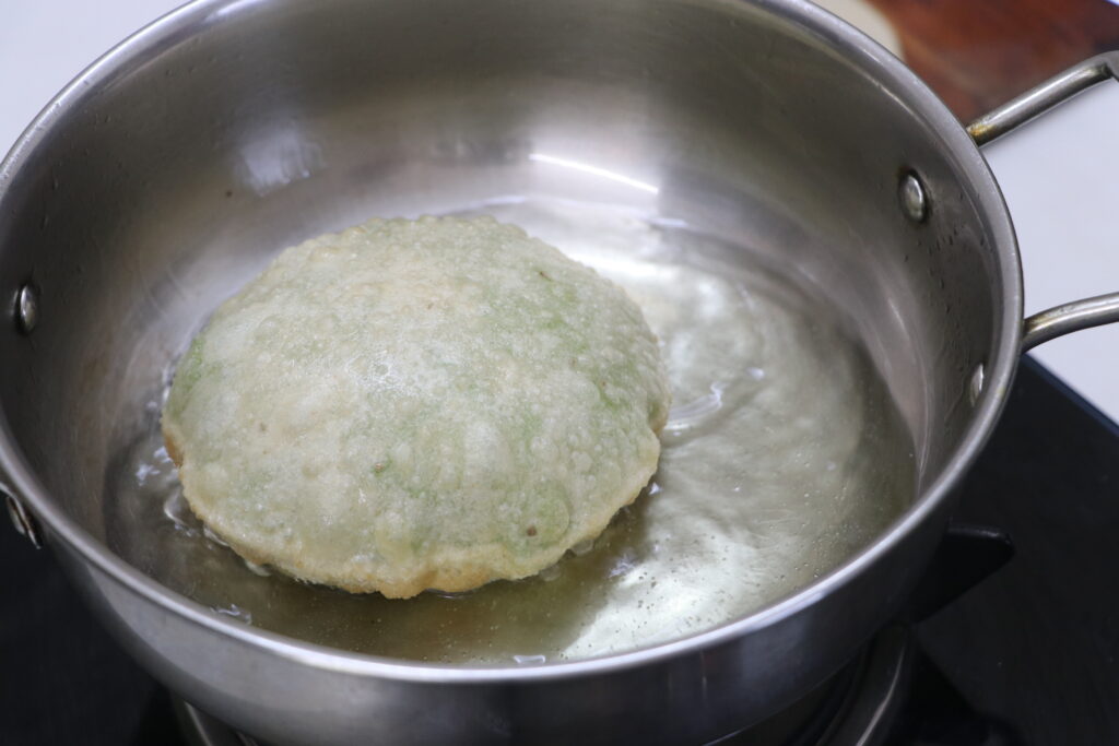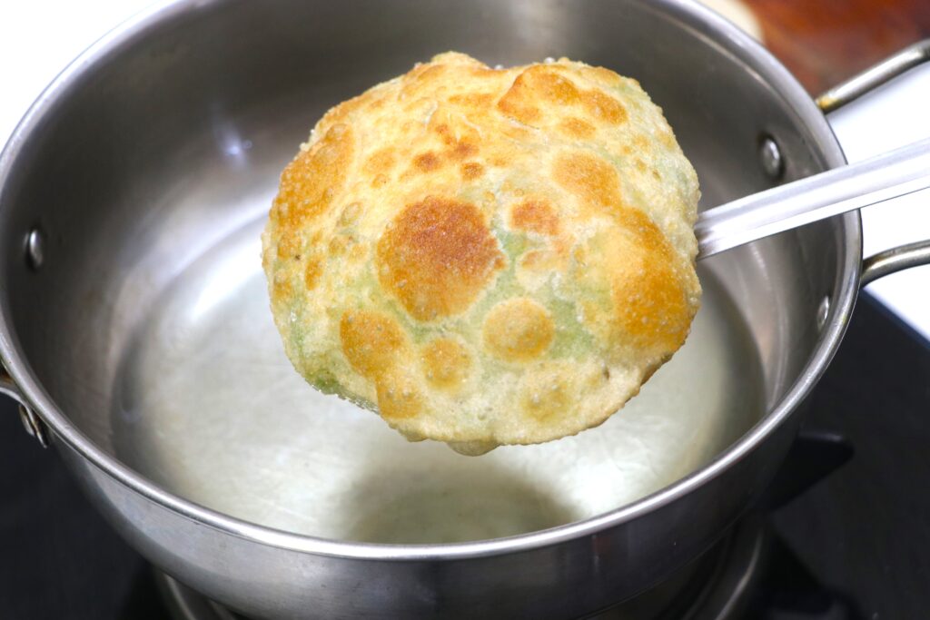 - Slide the stuffed poori into the hot oil. Gently pour hot oil over the top so it puffs beautifully.